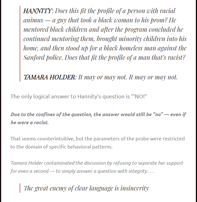 Even if Zimmerman had gunned him down as the Grand Wizard of the Ku Klux Klan, the only logical answer to Hannity’s question would still be “No!”