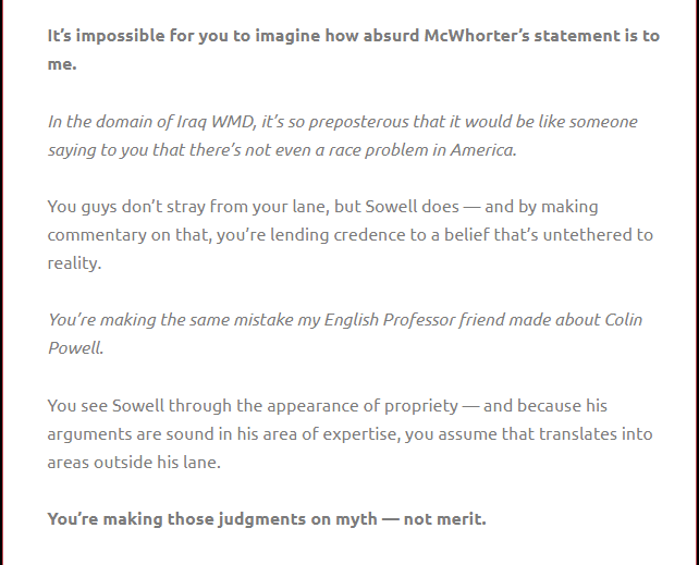 And even reasonable minds like Loury and McWhorter — sanction Sowell’s conclusions simply by virtue of casually commenting on his commitment to facts . . .