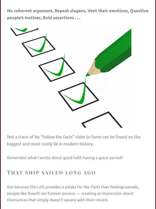 I’ve been practically spit on by people promoting principles I followed to find he didn’t. I’ve written many pieces on Sowell and this is the best his crowd has to offer: