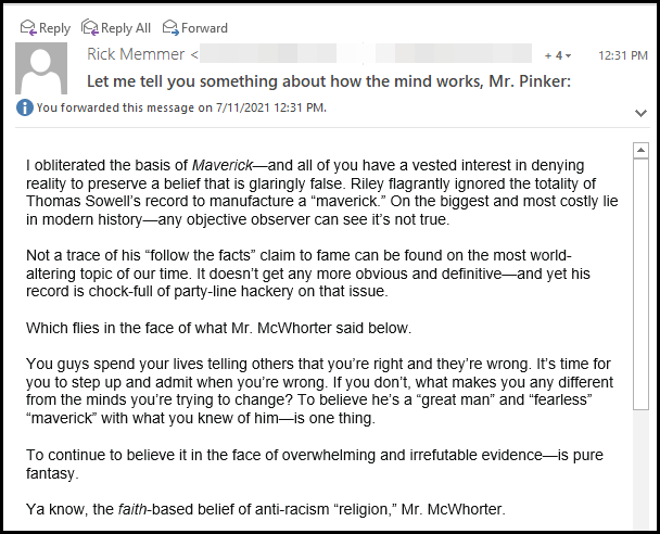 You’ll find the full email in What a Fool Believes He Sees — my response to Loury’s utterly ridiculous defense.