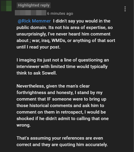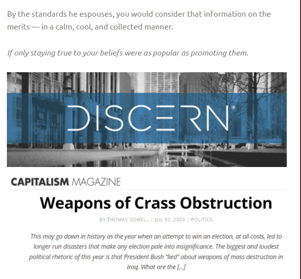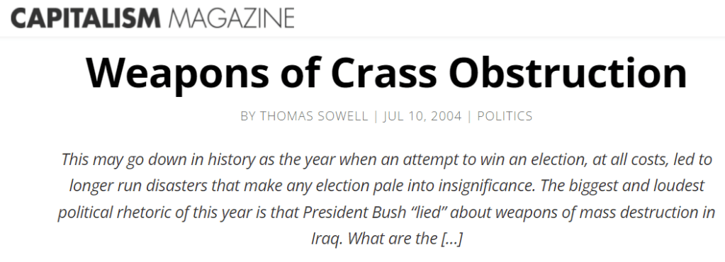 What Sowell wrote on WMD is a disgrace, and yet it’s seen as solid gold — because his name is on it. Such blind faith — along with fans who don’t even care one way or the other: