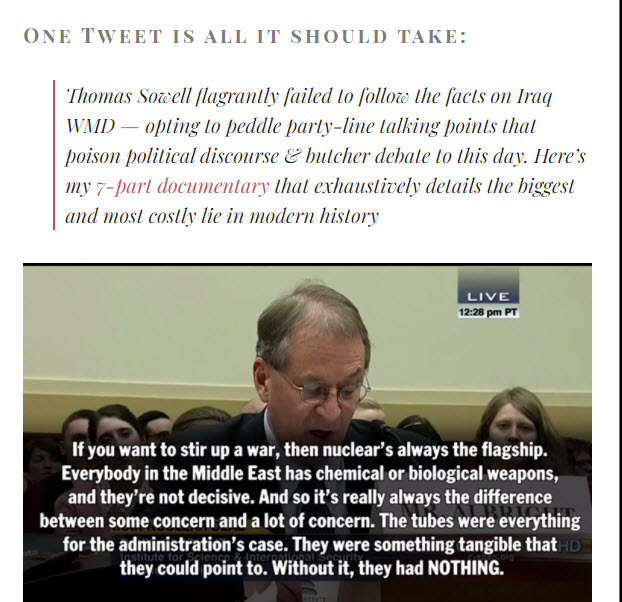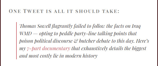 Thomas Sowell flagrantly failed to follow the facts on Iraq WMD — opting to peddle party-line talking points that poison political discourse & butcher debate to this day. Here’s my 7-part documentary that exhaustively details the biggest and most costly lie in modern history