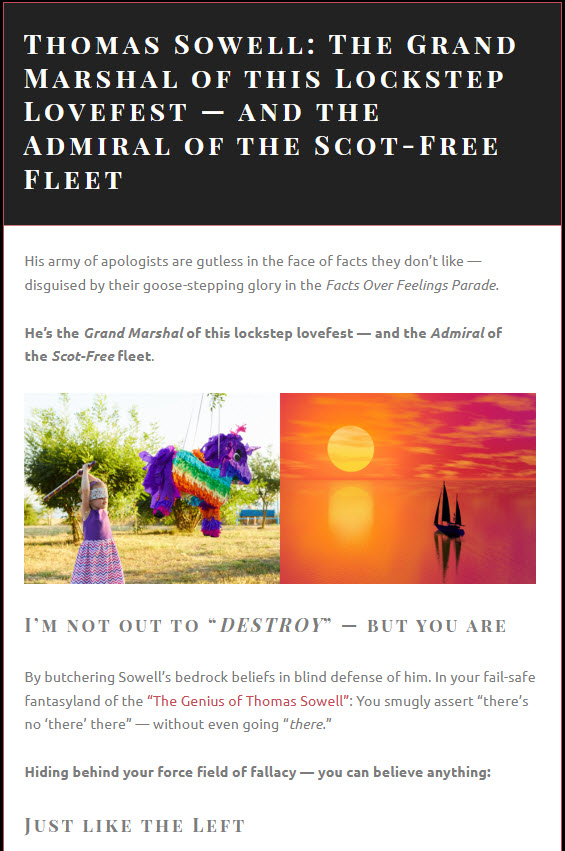 I don’t care if you don’t like my style or my site — but such high praise from a man of his caliber should count for something. I’m not going after Sowell for run-of-the-mill reasons.