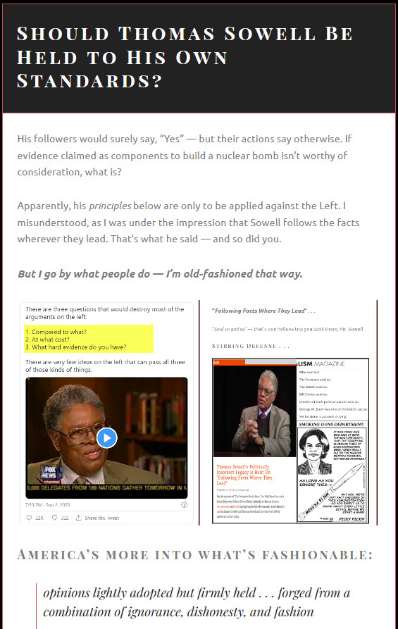 These people do nothing but question my motives, mock my site, and assault my character — then proudly post quotes of Sowell looking stately as he condemns the very thing they’re doing.
