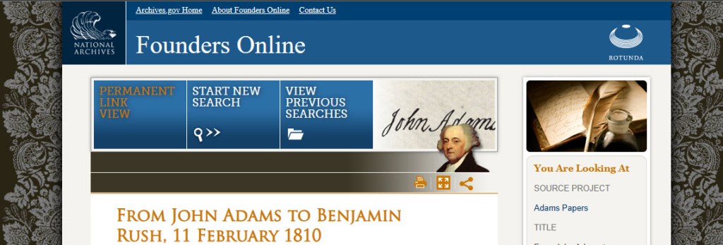 It didn’t hit me till later — but that quote is from a letter that Adams wrote to Benjamin Rush (friend and fellow signer of the Declaration of Independence).
