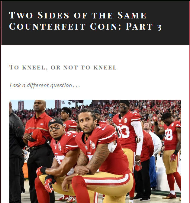 The right thing tends to be the demanding thing — the difficult that can’t be captured in slogans, kneeling, and knocking down monuments. I don’t care if Kaepernick kneels — I care that you can’t solve multidimensional problems with one-dimensional gestures.