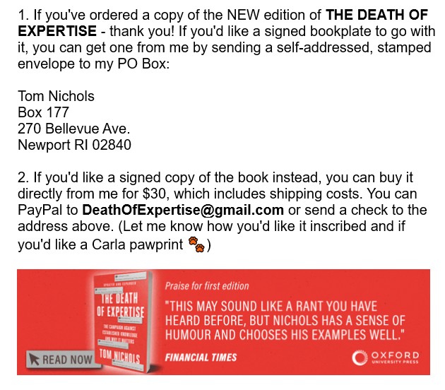 When I saw Tom Nichols touting his upcoming book in a Tweet, I had to laugh — as the tragedy of it all is so comical anymore.