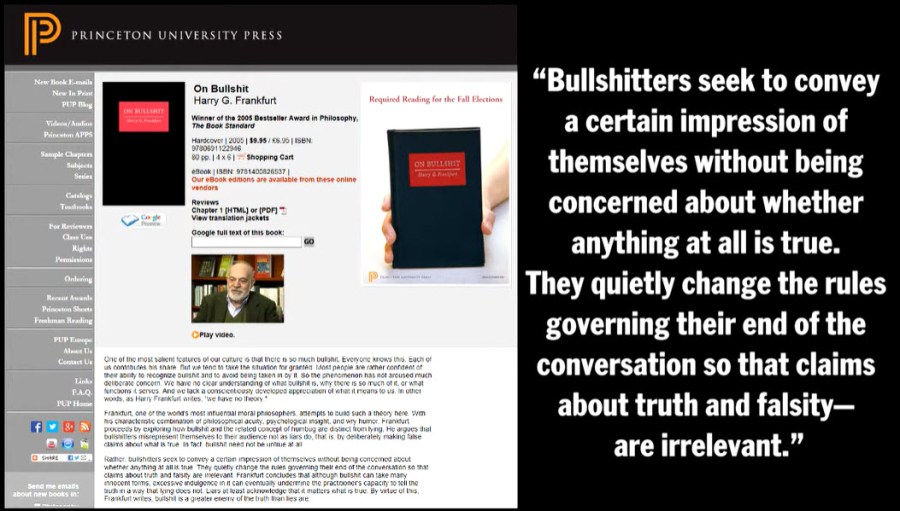 The bullshitter . . . does not reject the authority of the truth, as the liar does, and oppose himself to it. He pays no attention to it at all. By virtue of this, bullshit is a greater enemy of the truth than lies are.
