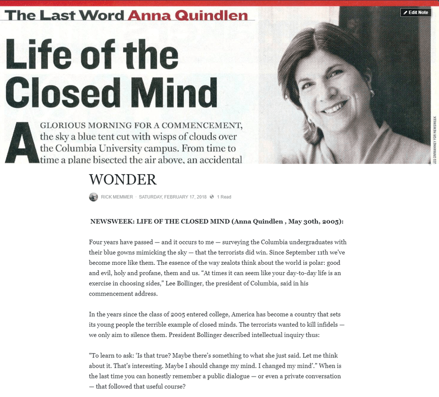 She has lived up to what Columbia President Lee Bollinger described as intellectual inquiry in Anna Quindlen’s article Life of the Closed Mind:
